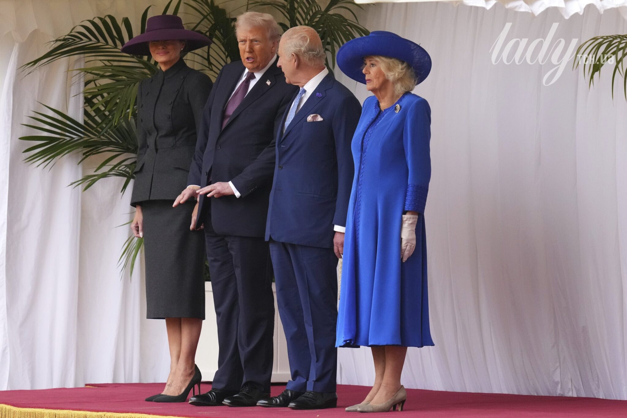 Стосовно їхнього вбрання, джерела надають детальну інформацію про одяг Меланії Трамп, але не згадують, у що був одягнений Дональд Трамп. Меланія була одягнена в класичний образ від відомих європейських брендів, обраний з урахуванням пізнього вечора та мінливої британської погоди. На ній був знаковий тренч пісочного кольору Burberry Kensington Heritage, який вона щільно застібнула. На ноги перша леді взула шкіряні черевики для верхової їзди Christian Dior Empreinte.