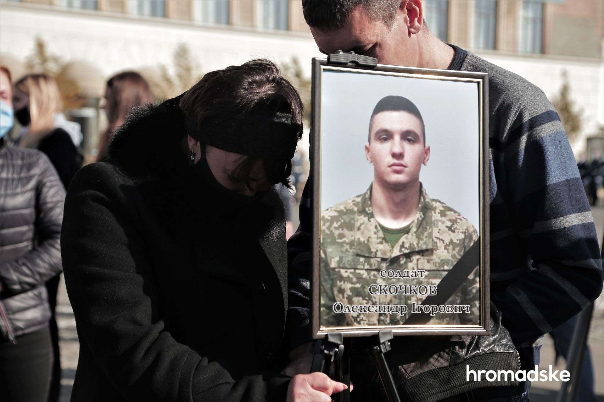 Під траурну мелодію, яку виконує військовий оркестр, на площу з автобусів виносять труни з тілами загиблих. Диктор називає звання, ім’я та прізвище кожного загиблого, рік народження. Також повідомляє, де навчався і служив загиблий.