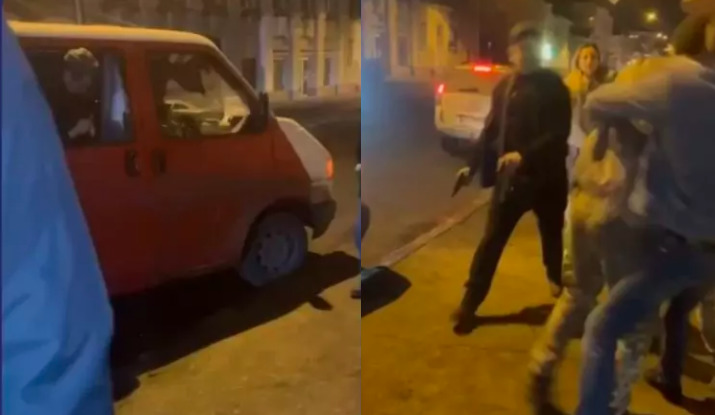За словами очевидців, все почалося з того, що працівники ТЦК під’їхали на бусику, швидко вийшли з автомобіля і скрутили двох хлопців. Один із перехожих, побачивши це, схопив пістолет і розбив вікно в автомобілях, після чого затримані почали вибиратися з бусика.