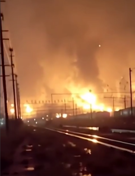 Як пише Telegram-канал Astra, геолокувальні кадри очевидців справді знято на станції “Тацинська” біля червоної водонапірної вежі. За пожежею на кадрах видно місцевий елеватор.