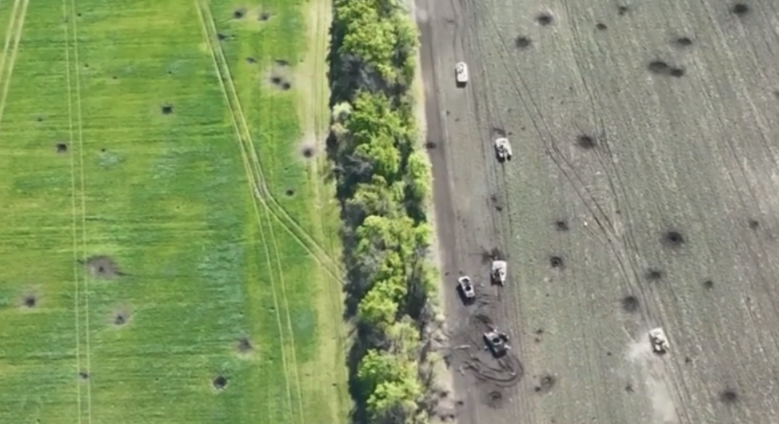 На відео показано процес ураження колони російської бойової техніки, яка рухалася польовою дорогою вздовж лісосмуги.