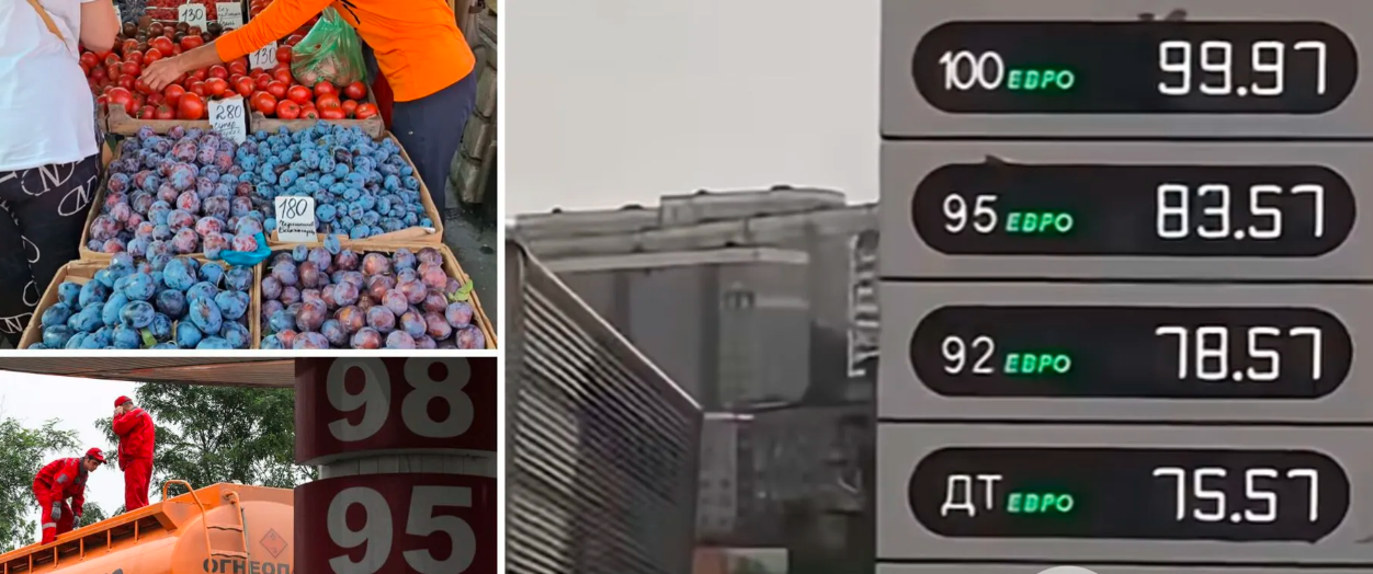 На базарах продають огірки за ціною 170-250 руб. (75-125 грн). Помідори – по 120-130 руб. (60-65 грн). Продавці скаржаться, що бензин доводиться купувати втридорога у перекупників, щоб доставити товар на ринок.