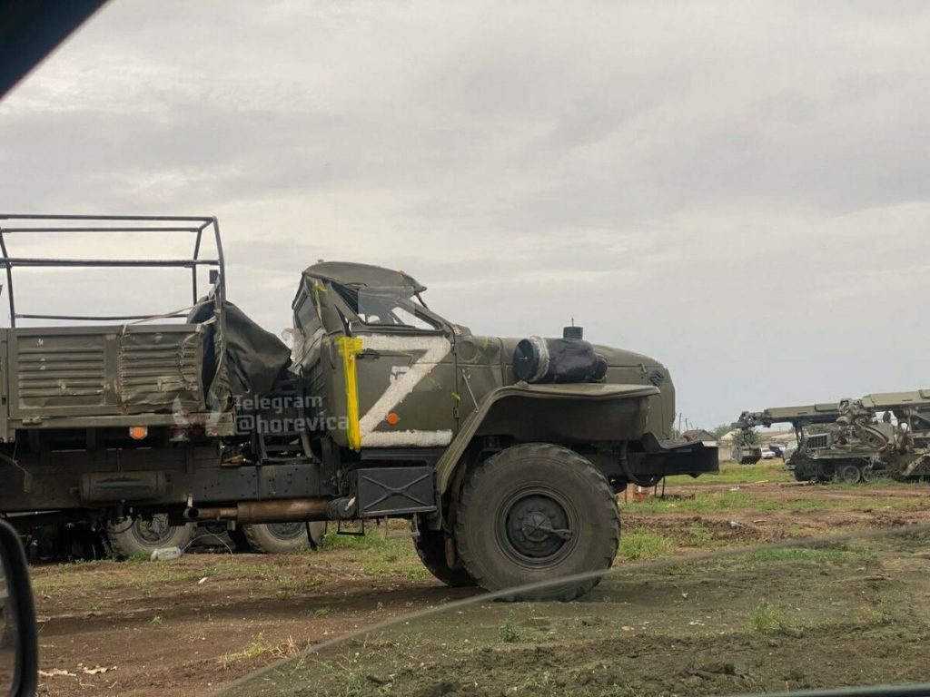 На тимчасовому місці розташуванні техніки помітно багато пошкодженої автотехніки з тактичними знаками у вигляді латинської літери «Z», а також самохідні артилерійські установки та інженерні військові машини.