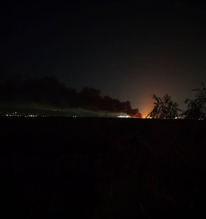 Після атаки безпілотників виникла сильна пожежа, яку видно, незважаючи на ніч. На зроблених з місця подій відео помітно величезний стовп диму, який здіймається на десятки метрів.