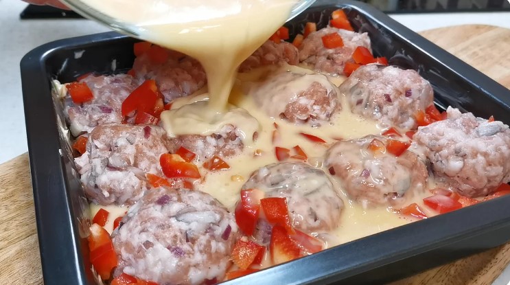 Далі просто залити її в форму з хлібом і фрикадельками.
