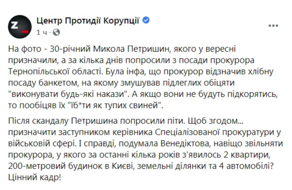 Після скандалу Петришина попросили піти. Щоб згодом… призначити заступником керівника Спеціалізованої прокуратури у військовій сфері. І справді, подумала Венедіктова, навіщо звільняти прокурора, у якого за останні кілька років з’явилось 2 квартири, 200-метровий будинок в Києві, земельні ділянки та 4 автомобілі? Цінний кадр!
