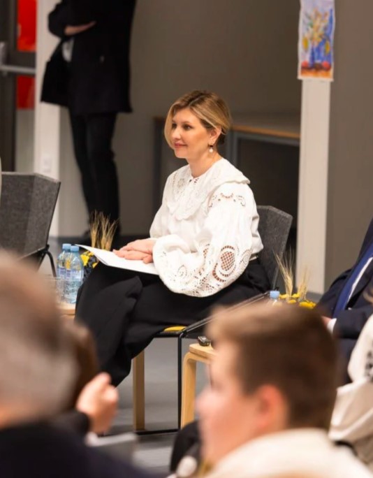 Там дружина президента з’явилася у гарній білій вишиванці, виконаній у техніці рішельє і “білим по білому”, з вишуканим коміром із флористичним орнаментом. Її Олена поєднала з чорними штанями-палацо, білим поясом і чорними гостроносими туфлями.