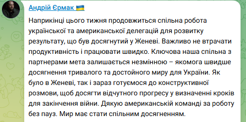 Єрмак зазначив, що нинішня підготовка до перемовин відбувається за тим самим принципом, що й у Женеві, — з акцентом на конструктивність і чітке визначення подальших кроків для завершення війни.