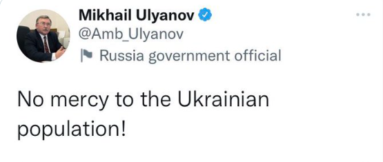 Крім того, відомство закликає визнати російського дипломата нон ґрата. Причина таких закликів – “твіт” Ульянова, в якому він закликав не щадити населення України.
