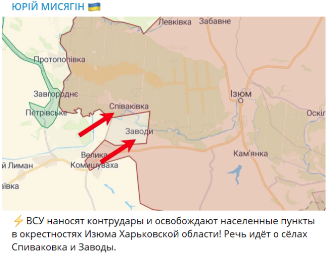 “ЗСУ наносять контрудари та звільняють населені пункти на околицях Ізюму Харківської області! Йдеться про села Співаківка та Заводи”, – пише Мисягін.