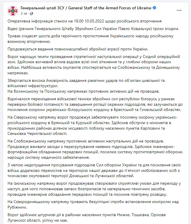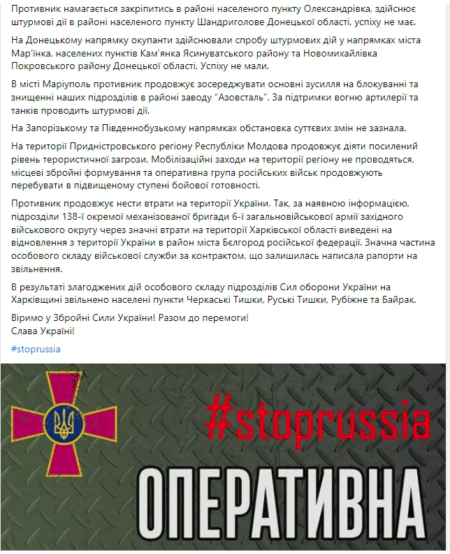 Ворог продовжує нести втрати. Про це у вечірньому оперативному зведенні розповіли у Генеральному Штабі Збройних Сил України.