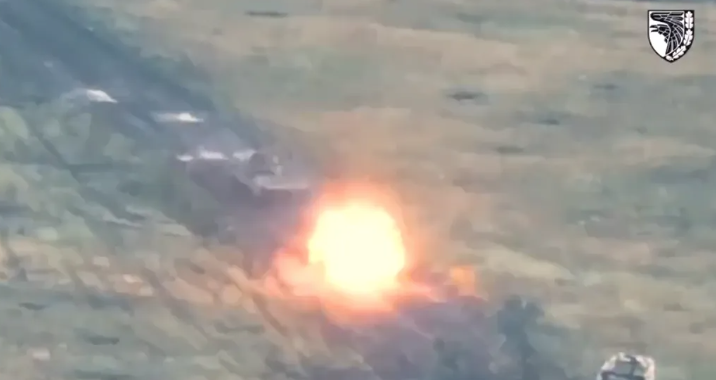 На відео видно, як дві ворожі БМП їдуть ґрунтовою дорогою посеред поля. В якусь мить у першу з російських бронемашин прилітає український снаряд, вона вибухає.
