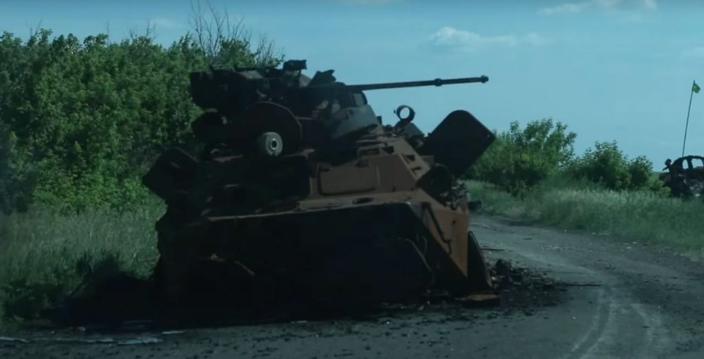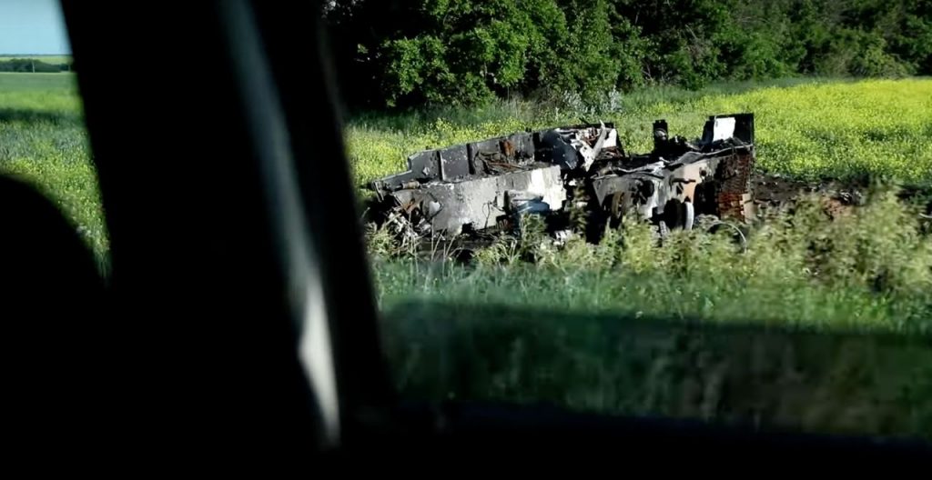 На дорозі, якою рухаються журналісти, стоїть спалена техніка. Військові розповіли, що одну з БМП-2 знищили з ПТРК NLAW.